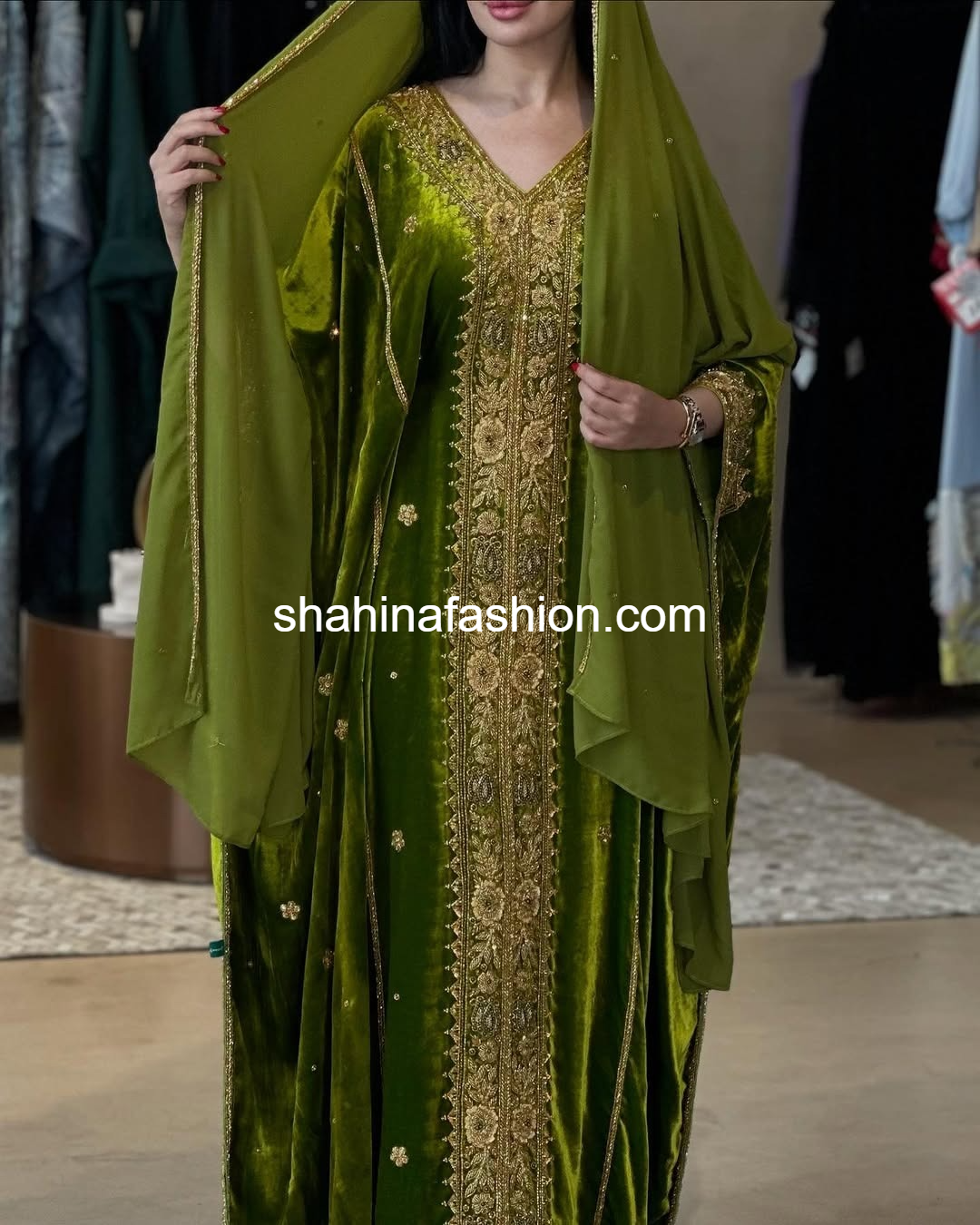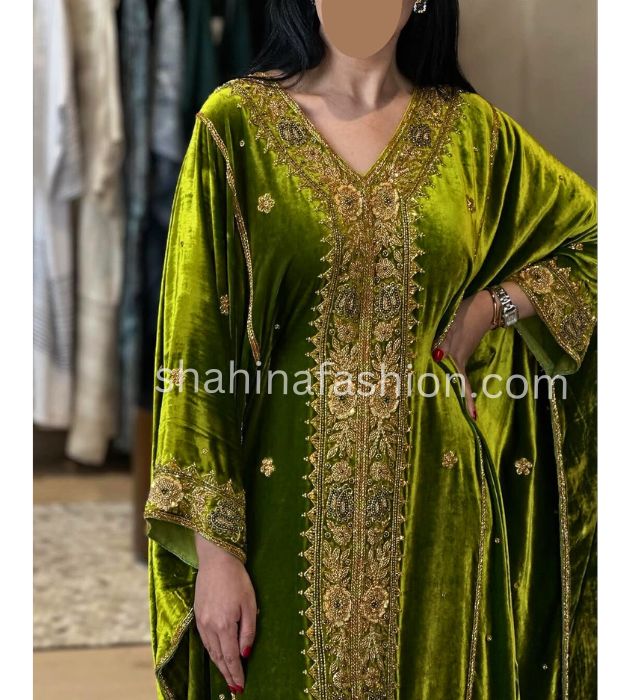 Luxurious velvet kaftan with premium beads, Golden work, and elegant design. Available in XS to 6XL sizes. Perfect for formal, semi-formal, and special occasions like weddings, parties, and more