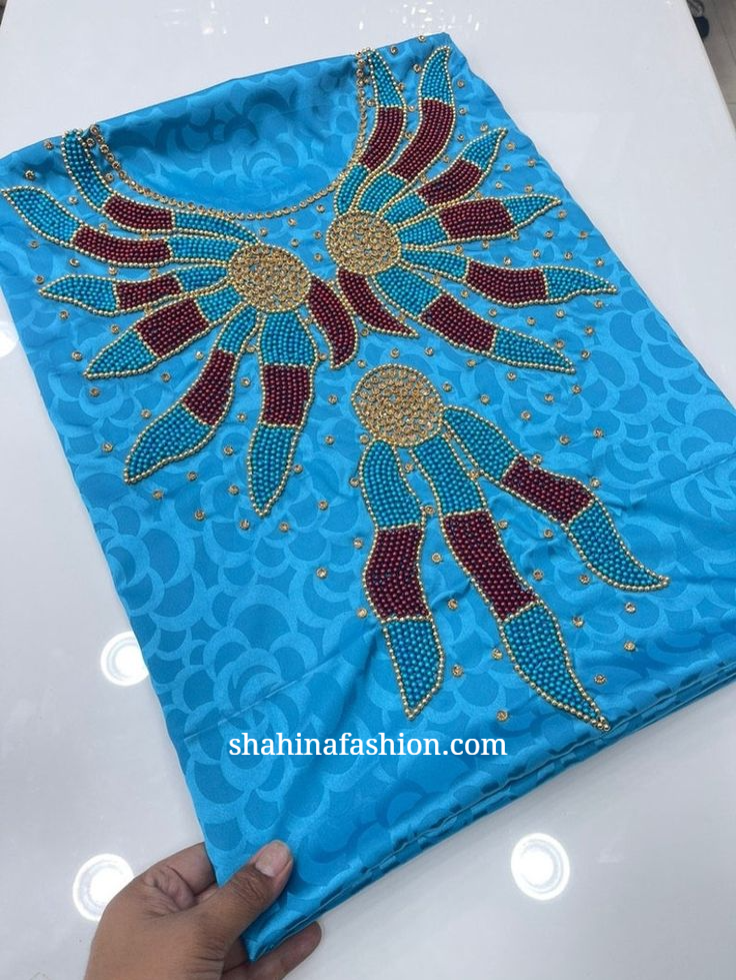 2. Premium Beading:Premium embellished beaded with golden, Firozi and maroon Beads Work.