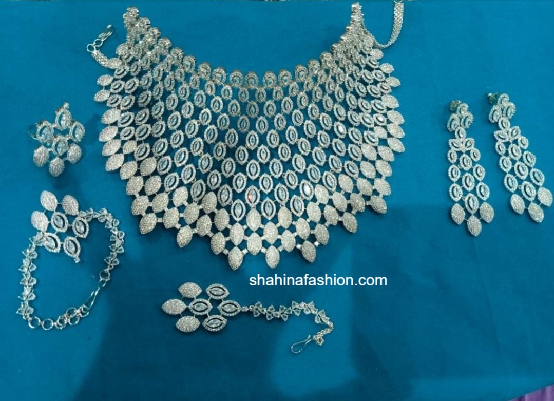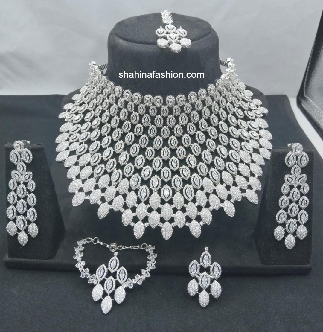 -Silver American Diamond Design: Exquisite and stylish necklace set featuring intricate details.
