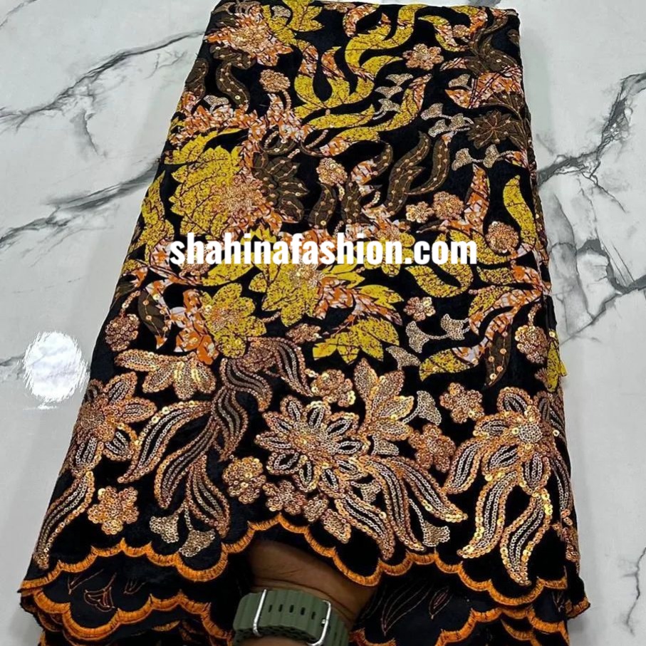 Color: Black base with yellow, copper, and bronze embroidery and sequins