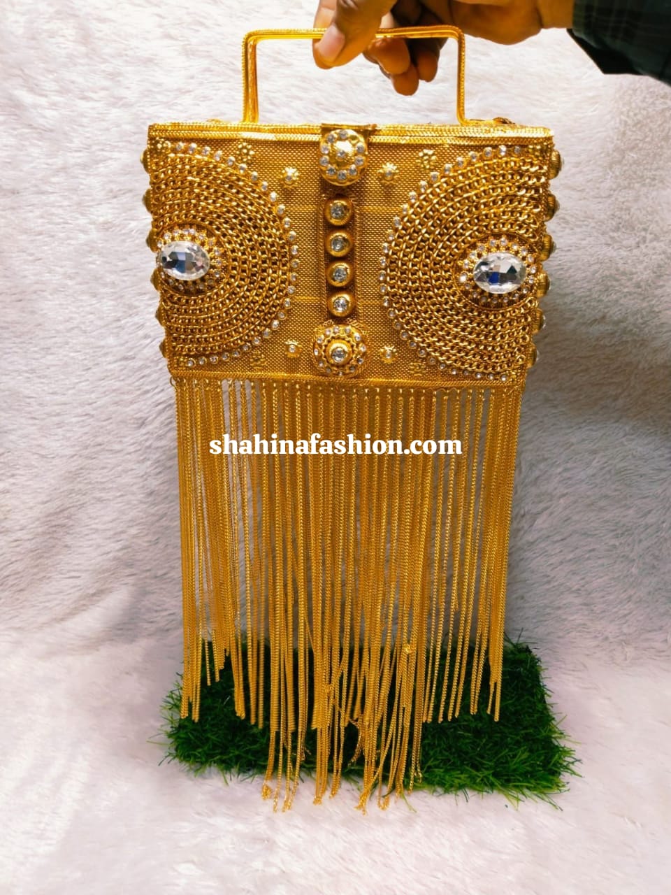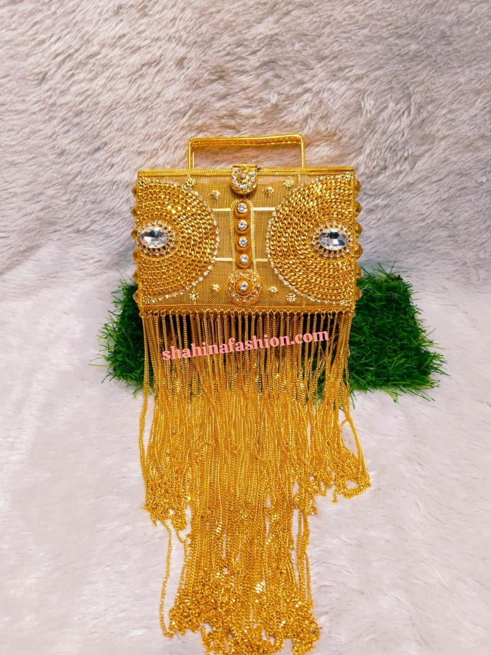 Add a touch of timeless glamour to your evening look with this exquisite golden beaded handbag — a must-have accessory for the elegant woman.